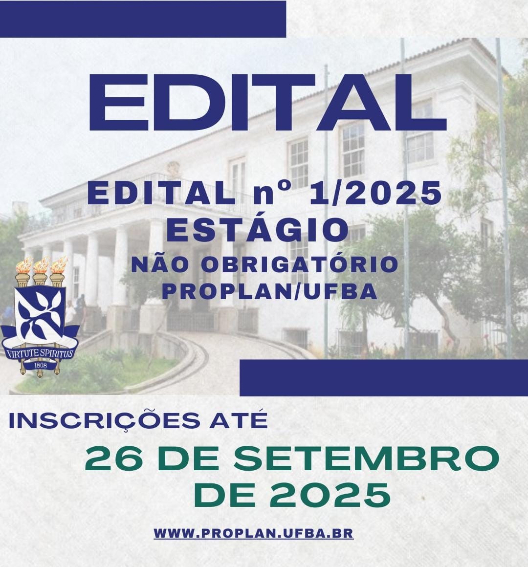 A Pró-Reitoria de Planejamento e Orçamento (PROPLAN) informa a publicação de retificação de cronograma do processo seletivo para estágio não obrigatório na PROPLAN, com a data limite para inscrição alterada para 26/09/2025.